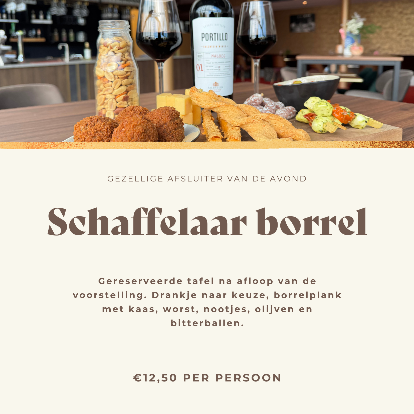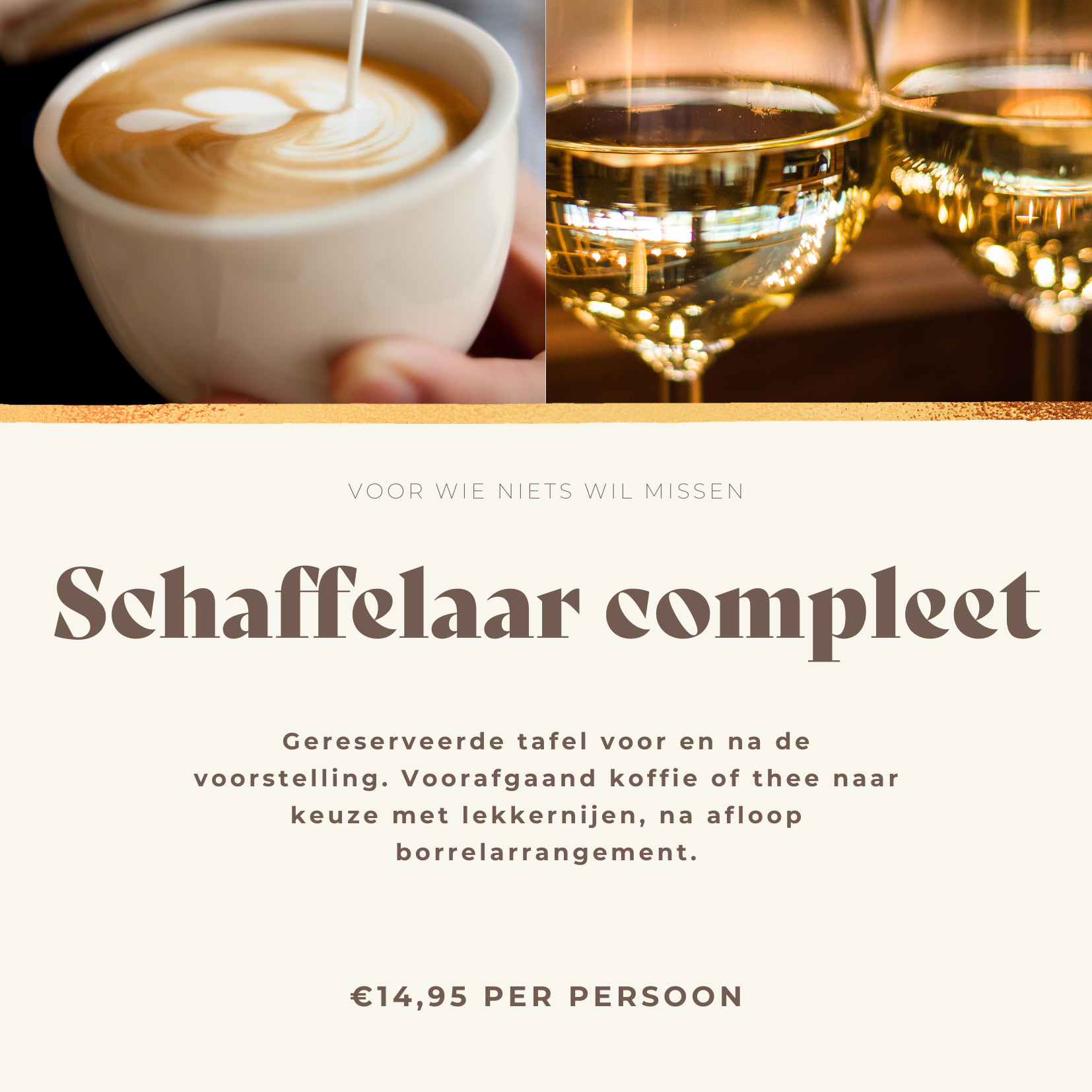 Maak je theateravond compleet met onze Schaffelaar Genietarrangementen. Van een warme start met koffie of thee en lekkernijen voor de echte zoetekauw tot een gezellige borrel na afloop: wij zorgen voor een gereserveerde tafel en nét dat vleugje extra. Boek nu alvast een arrangement voor een ontspannen avond uit.